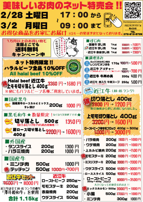 🥩今月もお得が満載のネット特売 開催! 🥩いつもご利用ありがとうございます。ネット限定特売のお知らせです📱✨📅 2/28(土)17:00〜📅 3/2(月)9:00まで※発送は 3/4以降予定 となります今回も✔ ご家庭で使いやすい定番商品✔ 調理に最適!煮込み・鍋向け✔ 近江牛・黒毛和牛・ハラール対応商品を中心に、ネット限定の特別内容でご用意しました🔥🍢 様々な料理に大活躍の牛すじ🍲 温めるだけの調理済み商品🥩 すき焼き・しゃぶしゃぶ向けの人気部位🎁 贈り物にも使いやすいローストビーフ系さらに…📦 1万円以上のお買い物で全国送料無料🕌 ハラルビーフはネット特売限定でお得に毎日の食卓をちょっと贅沢に✨まとめ買いにもおすすめの内容です。数量限定品もアリ!ぜひお早めにチェックしてください😊👇 ご注文はいつものネットショップからフロンティアパワーズでのお買い物ぜひお楽しみください!※商品は2/28 17時より販売開始(予定)です。 カテゴリー: イベント情報 タグ: saleイベントお得セール売出し 0件のコメント コメントを残す コメントをキャンセルメールアドレスが公開されることはありません。 ※ が付いている欄は必須項目です 名前 * メール * サイト ご意見、ご感想をお願いします。 次回のコメントで使用するためブラウザーに自分の名前、メールアドレス、サイトを保存する。 お得なクーポンを受け取る