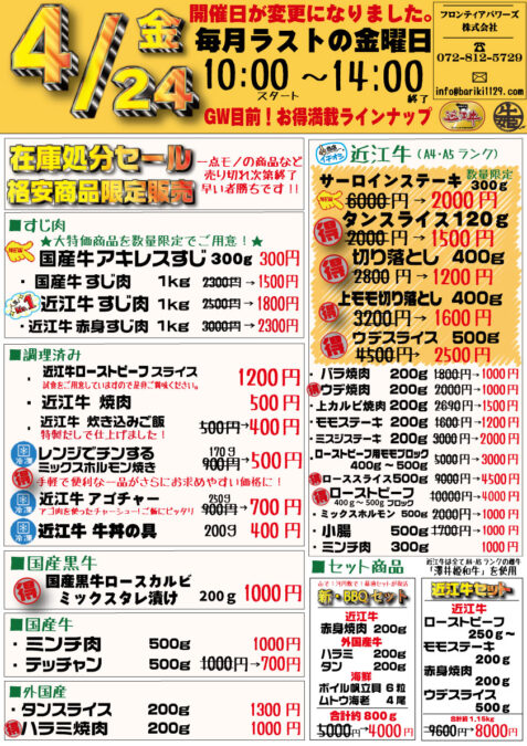 ホームイベント情報2026/4/24 萱島加工場前特売 2026/4/24 萱島加工場前特売 コメントする / イベント情報 / By フロンティアパワーズ 今月最後の売出しは萱島加工場にて4月24日(金) 10時〜14時開催!※整理券は9時頃から配布予定(遅めの配布です。ご注意ください。)京阪萱島駅近く 日新商店街(寝屋川市下神田町33)24日(金)お待ちしております! 最近の投稿 2026/4/24 萱島加工場前特売 新商品「ハラル認証 近江牛 牛骨」販売開始のお知らせ 新商品「ハラル認証 近江牛 リブキャップ」販売開始のお知らせ ゴールデンウィーク休業日のお知らせ(2026年) 2026/4/11 香里園売出し