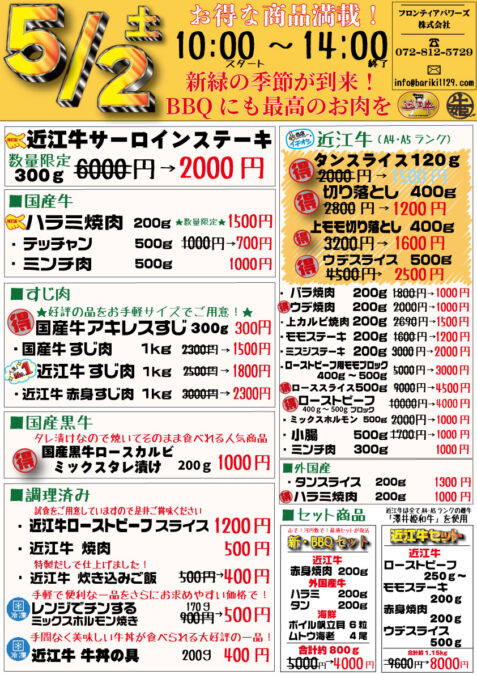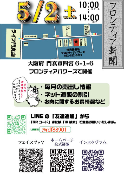 ホームイベント情報2026/5/2 四宮加工場前特売 2026/5/2 四宮加工場前特売 コメントする / イベント情報 / By フロンティアパワーズ GW真っ最中の四宮売出しは2日(土)10時〜14時開催!美味しいお肉が大特価!新緑の季節到来!バーベキューにも最適なお肉を多数ご用意しております。場所:門真市四宮6-1-6(ライフ門真店近く) 最近の投稿 2026/5/2 四宮加工場前特売 2026/4/27 ネット特売 便利なお支払い方法を追加致しました! 2026/4/24 萱島加工場前特売 新商品「ハラル認証 近江牛 牛骨」販売開始のお知らせ